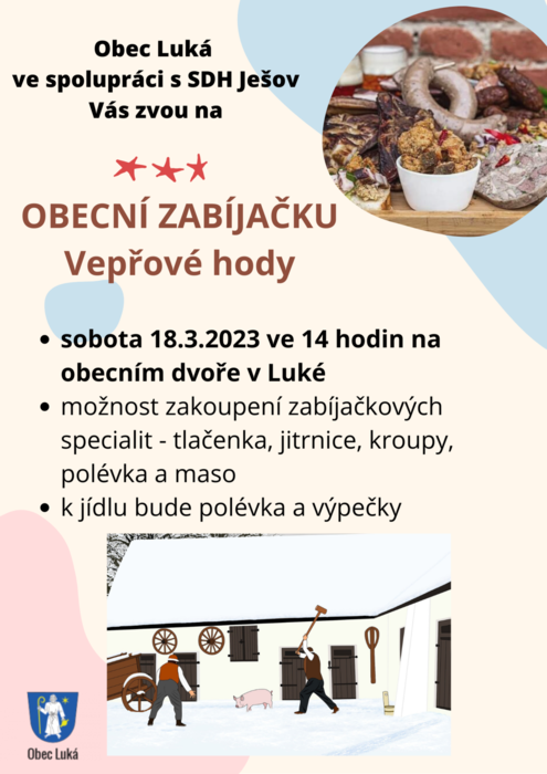 Zveme Vás na obecní zabíjačku - vepřové hody, 18.3.2023 ve 14 hodin na sběrném dvoře v Luké.