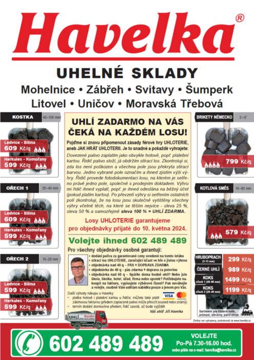 U firmy Havelka uhelné sklady JARNÍ SLEVY UHLÍ A JISTÁ VÝHRA V UHLOTERII s dopravou a pásem zdarma. Už jen do 10.května! Objednávejte uhlí, brikety a koks u Havelky na telefonním čísle 602 489 489.