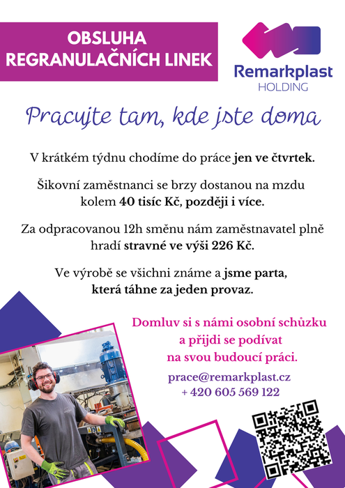 Úvod > Život v obci > Aktuality > Nabídka práce Remarkplast - Obsluha regranulačních linek