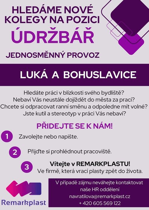 Úvod > Život v obci > Aktuality > Nabídka práce Remarkplast - Údržbář