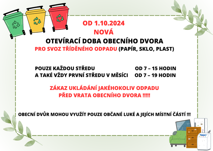 Úvod > Život v obci > Aktuality > Nová otevírací doba obecního dvora pro svoz tříděného odpadu