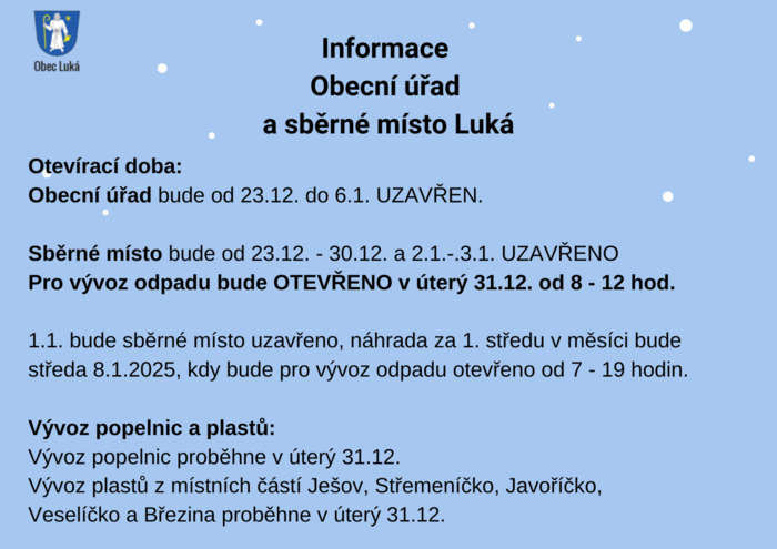 Úvod > Život v obci > Aktuality > Otevírací doba OÚ sběrného místa v době vánočních svátků