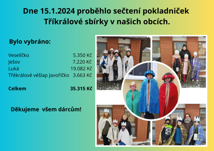 Úvod > Život v obci > Aktuality > Sečtení pokladniček Tříkrálové sbírky v našich obcích